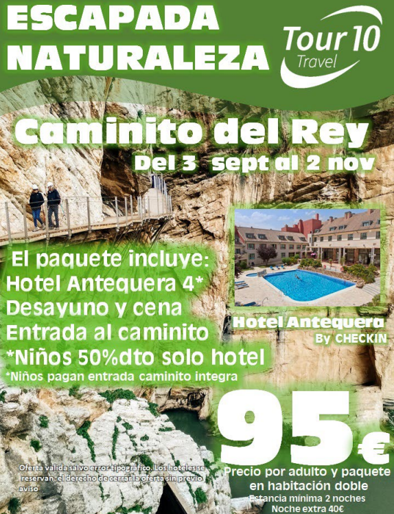 Tour10 te ofrece una espectacular escapada de naturaleza que consiste en alojarnos por 1 o 2 noches en hotel Antequera de 4* con el desayuno y las entradas al Caminito. El paquete incluye igualmente la cena posterior en el hotel. Todo desde 95 euros por persona. Un plan inmejorable para conocer una de las maravillas paisajísticas más bonitas que tenemos en España.