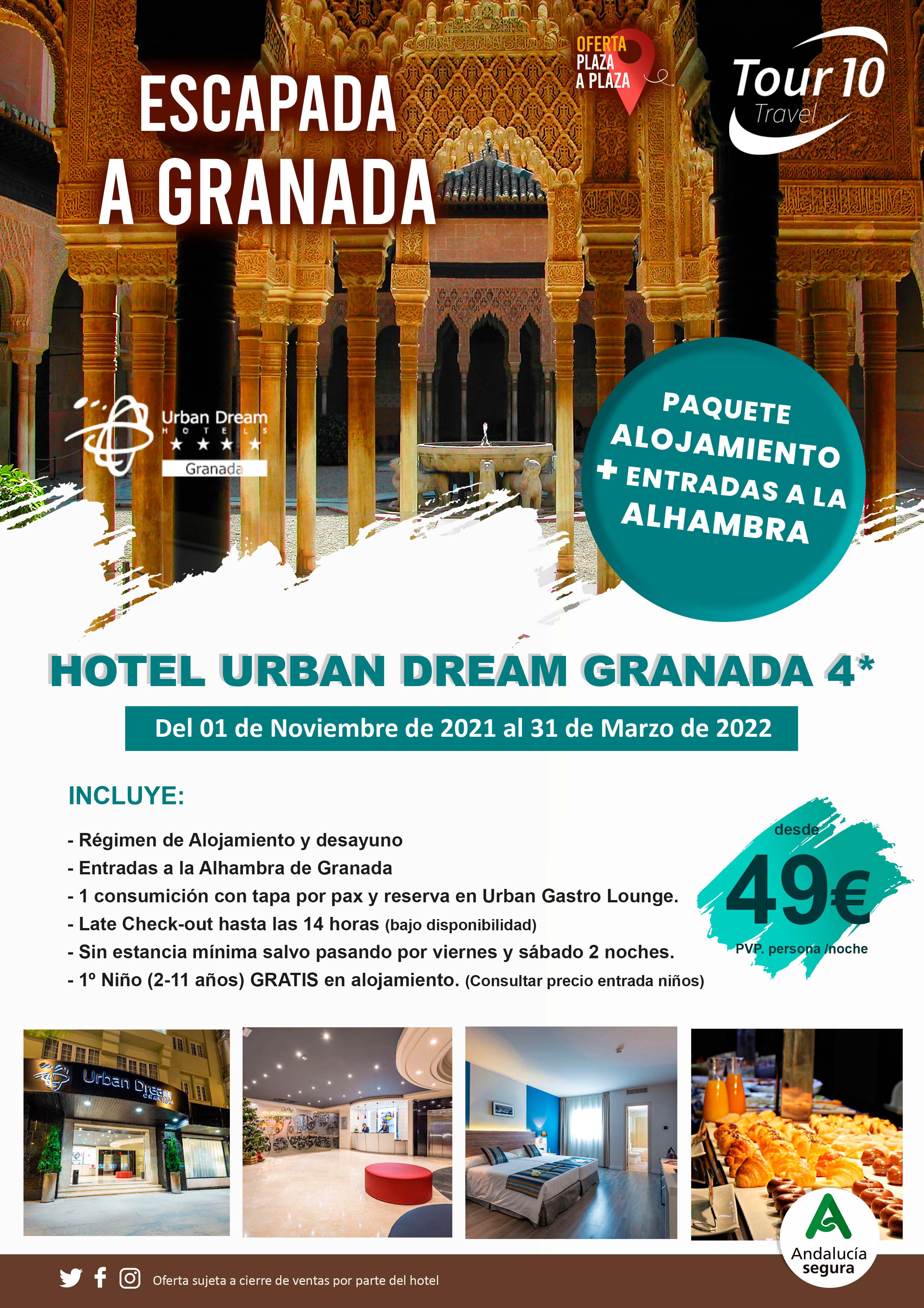Estancia en Granada con alojamiento y desayuno en hotel Urban Dream* con entradas a la Alhambra y 1 consumición en Urban Gastro Lounge desde tan solo 49 euros por persona.