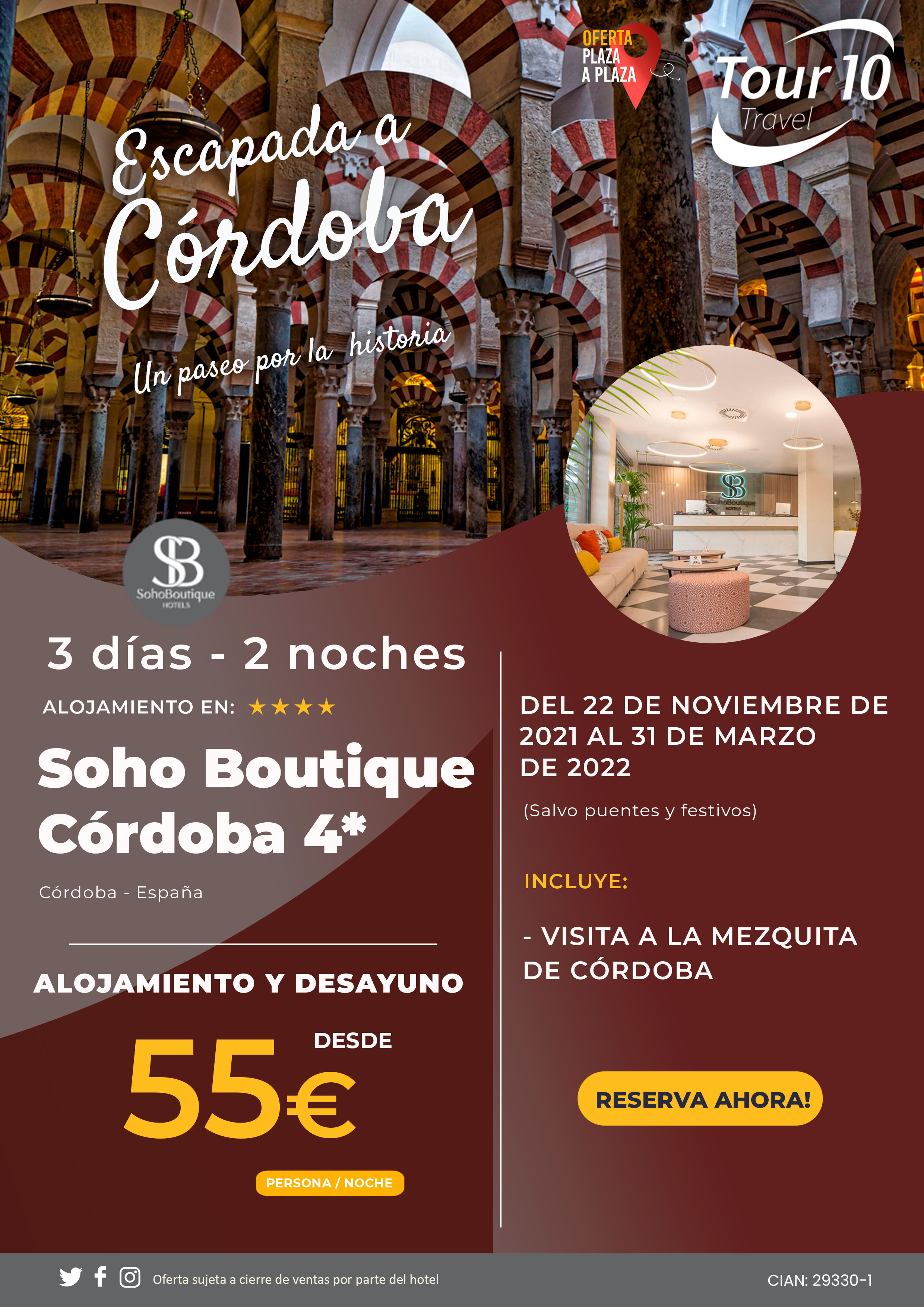 3 días-2 noches en Córdoba con alojamiento y desayuno en hotel Soho Boutique Córdoba 4* y entradas incluidas a la Mezquita Catedral desde tan solo 55 euros por persona.