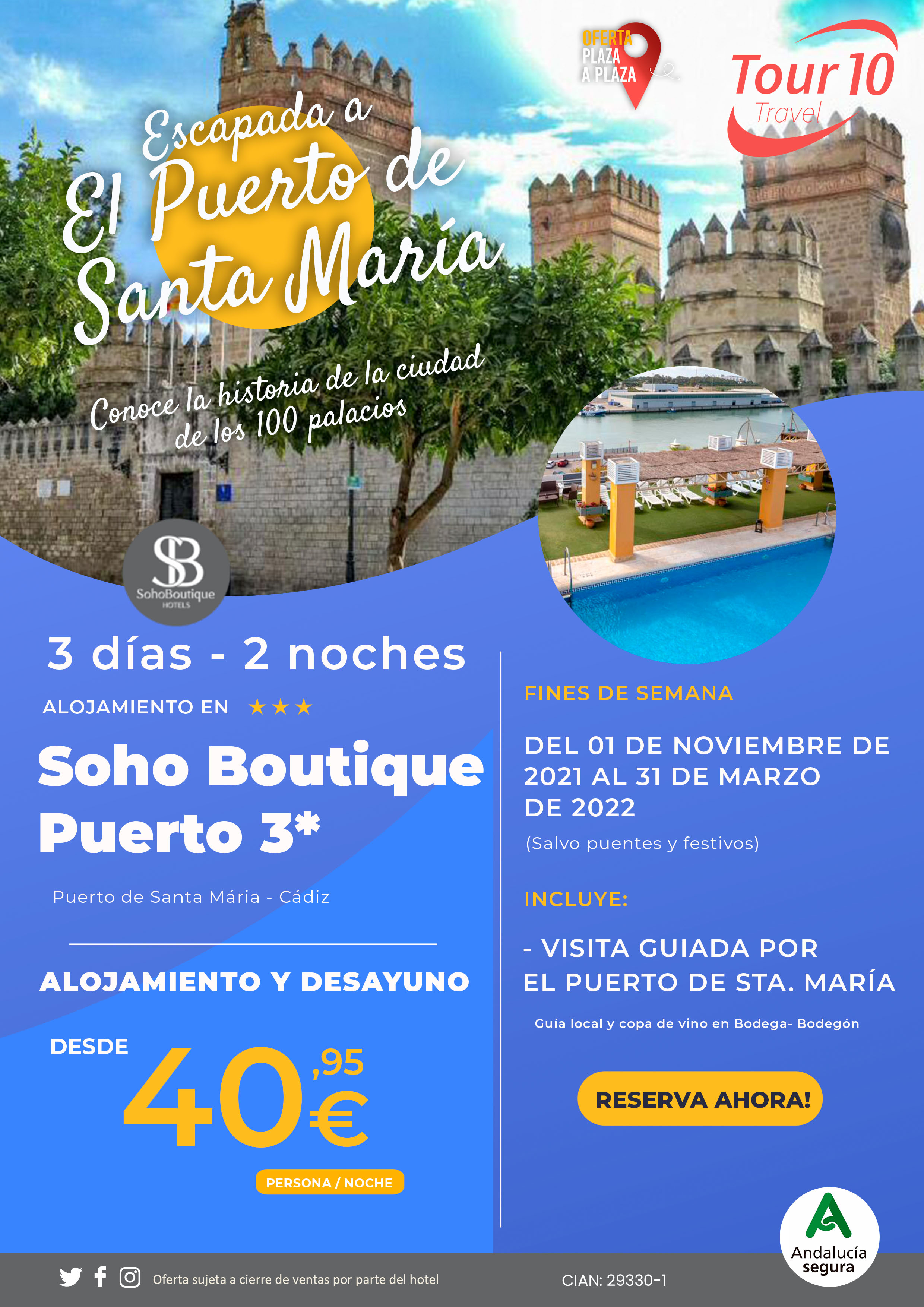 3 días-2 noches en El Puerto de Santa María con alojamiento y desayuno en hotel Soho Boutique Puerto 3* y visita con guía local por el Puerto de Santa María desde tan solo 40,95 euros por persona.